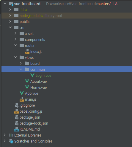 vue-frontboard 프로젝트를 열고 views 폴더 아래로 common 폴더와 안에 Login.vue 파일을 생성합니다.