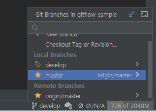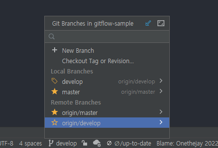 Git 브랜치 선택 메뉴를 클릭하면 Remote Branches에 develop이 생성되어 있는걸 볼수있다.