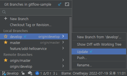 다시 인텔리제이로 돌아가서 Local의 develop 브랜치를 확인하자. Remote 저장소로부터 내려받을 것이 있다면 파란색 뱃지 모양으로 표시된다. (초록색 뱃지는 Commit할 내용이 있다는 의미이다.)