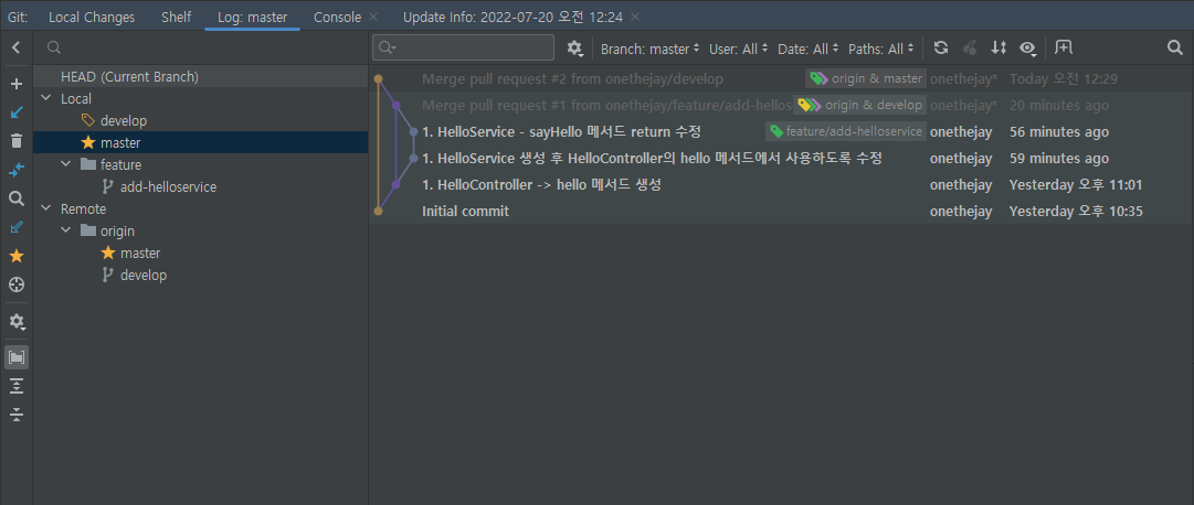 같은 방법으로 develop 브랜치를 master에 병합한다.