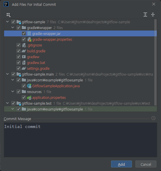 생성한 Git 저장소에 처음 올릴 파일을 보여준다. 따로 손댈건 없으니 바로 Add한다.