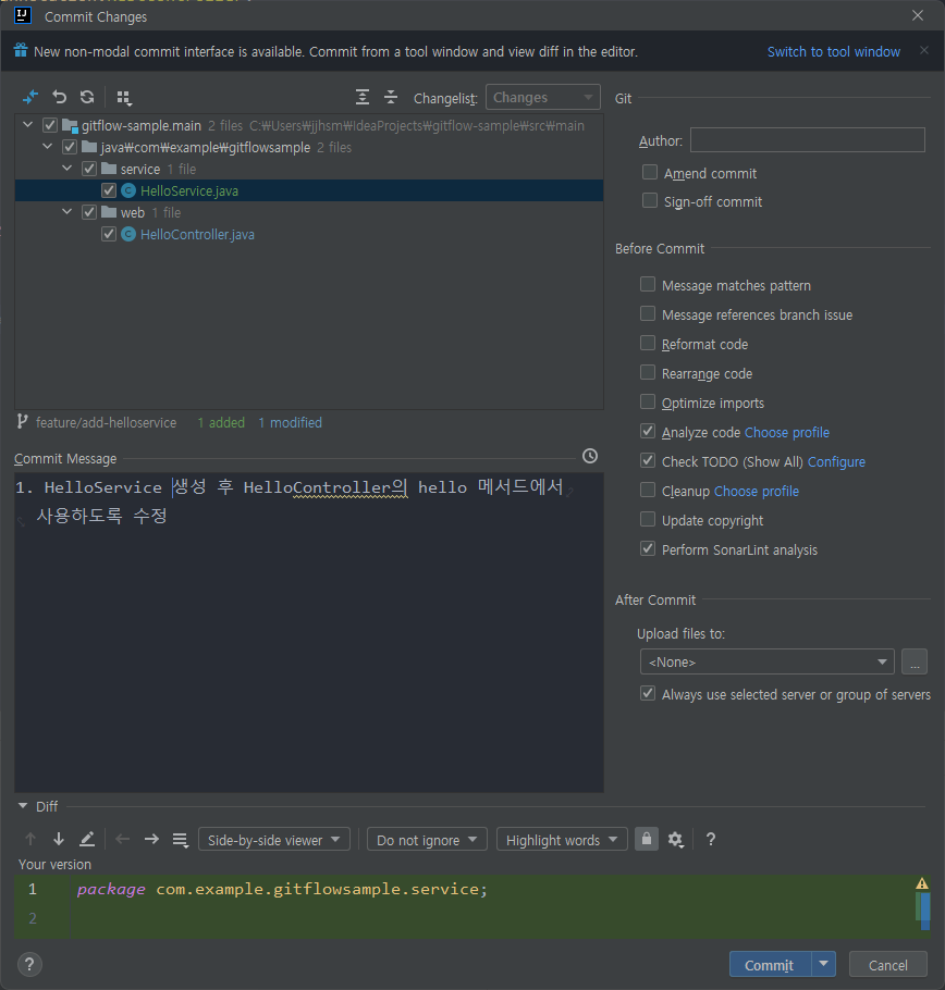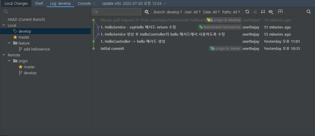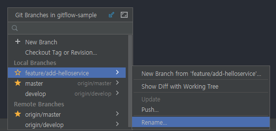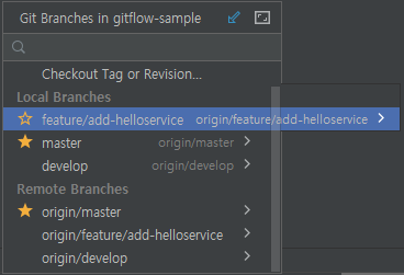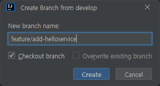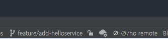 위에서 한것처럼 develop에서 가져온 feature 브랜치를 Local에 생성하자. helloservice를 생성할거라서 feature/add-helloservice로 이름을 지정하였다.