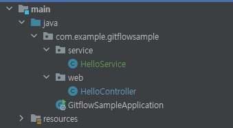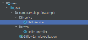 HelloService는 새로 생성되어 초록색으로, HelloController는 수정되어 파란색으로 표시된다.