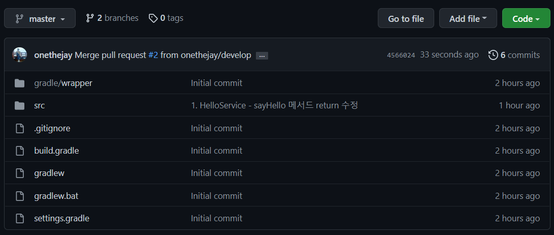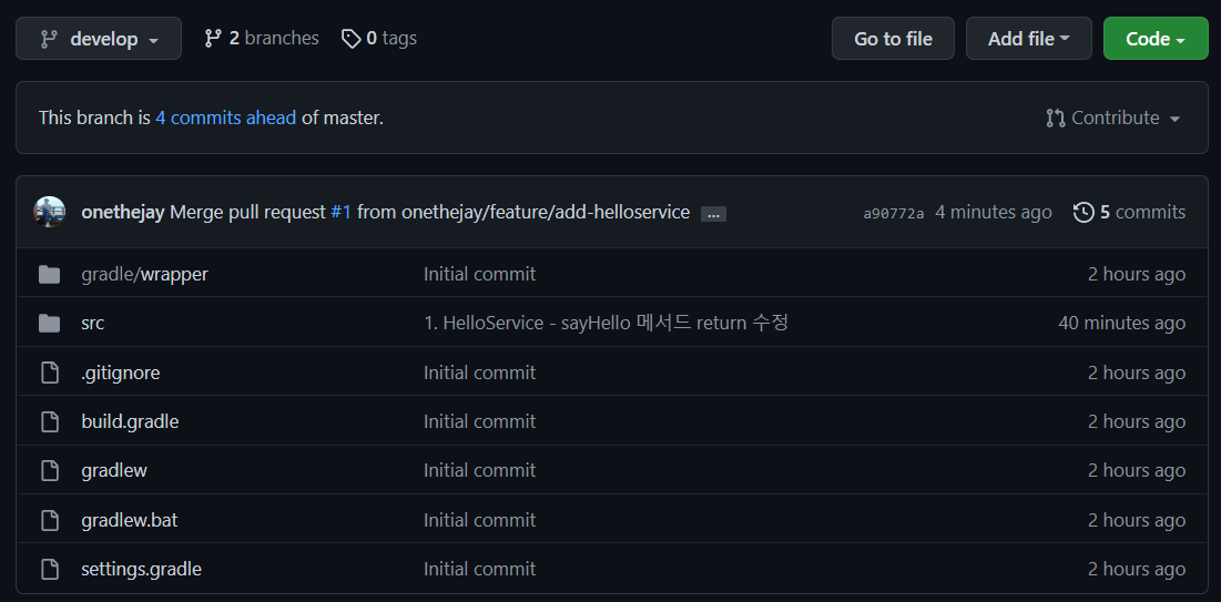 Github의 저장소의 develop 브랜치로 이동하면 방금 병합한 소스가 반영된것을 확인할 수 있다.