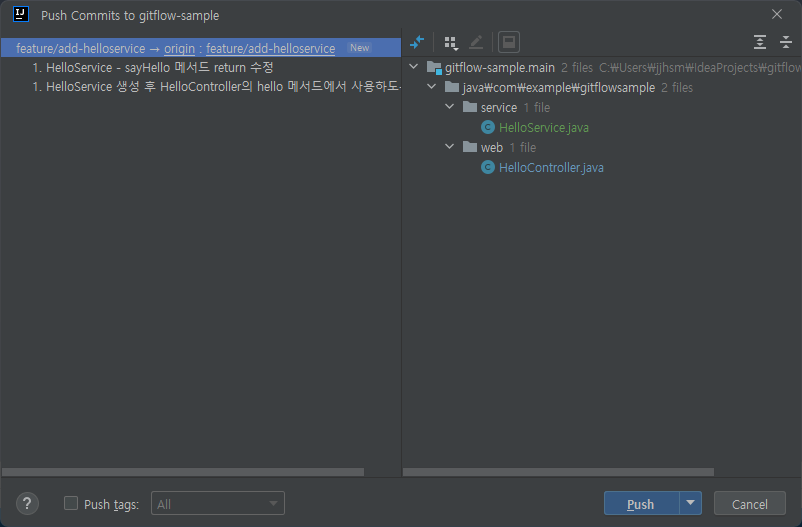 Push(Ctrl + Shift + K) 창을 열면 총 2개의 Commit이 있다. 위에서 작업 후 Push를 진행하지 않았으므로 2개가 그대로 준비되어있는것.