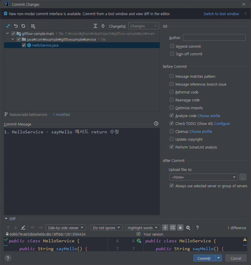 Push는 진행하지 않고 HelloService의 sayHello return을 수정하자.