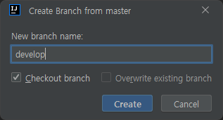 창이 나타나면 이름은 develop으로 입력하고 Checkout branch를 선택한다.