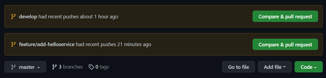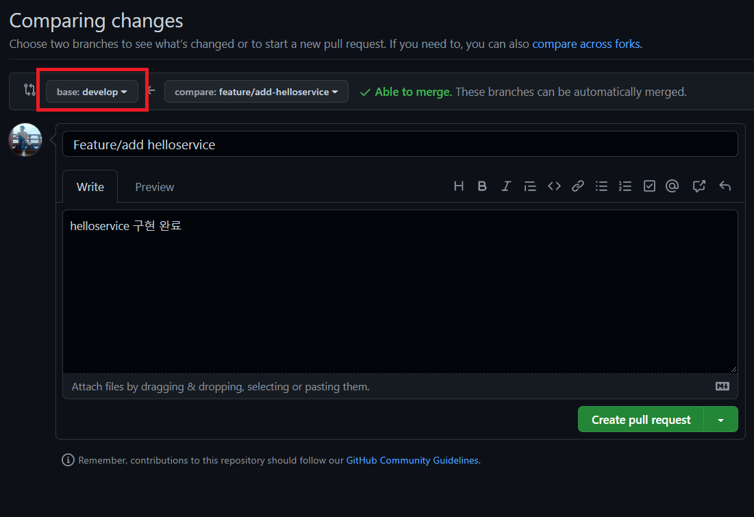 이번에 진행할 것은 feature의 내용을 develop에 올릴 것이므로 feature/add-helloservice의 Compare & pull request를 선택한다.