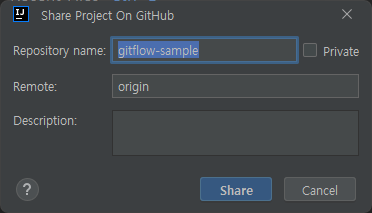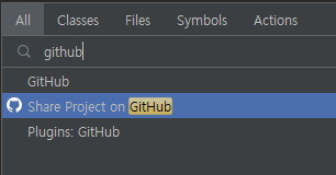 Search Anywhere(Shift 두번)에서 github를 입력하면 Github 아이콘과 함께 Share Project on Github이 나타난다. 선택.