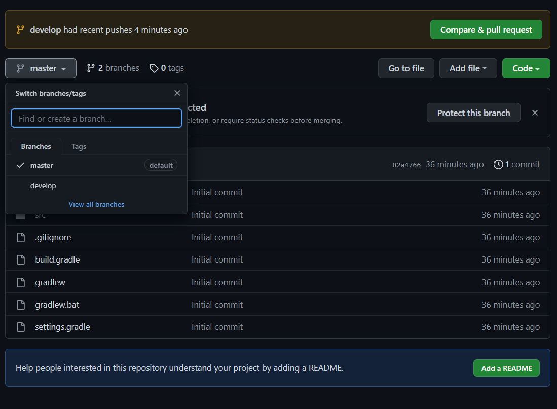 gitflow-sample에 들어가보면 develop 브랜치도 생성되어 있다.