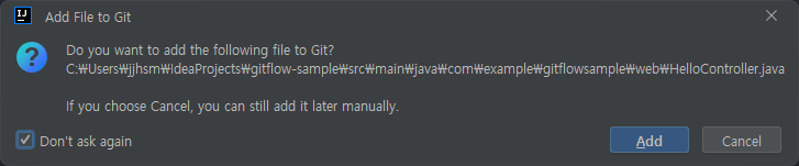 처음 파일을 생성하면 자동으로 Git에 저장할것인지 물어본다. 매번 창이 떠서 눌러주는것은 귀찮으니까 Don't ask again을 선택하고 Add를 누른다.