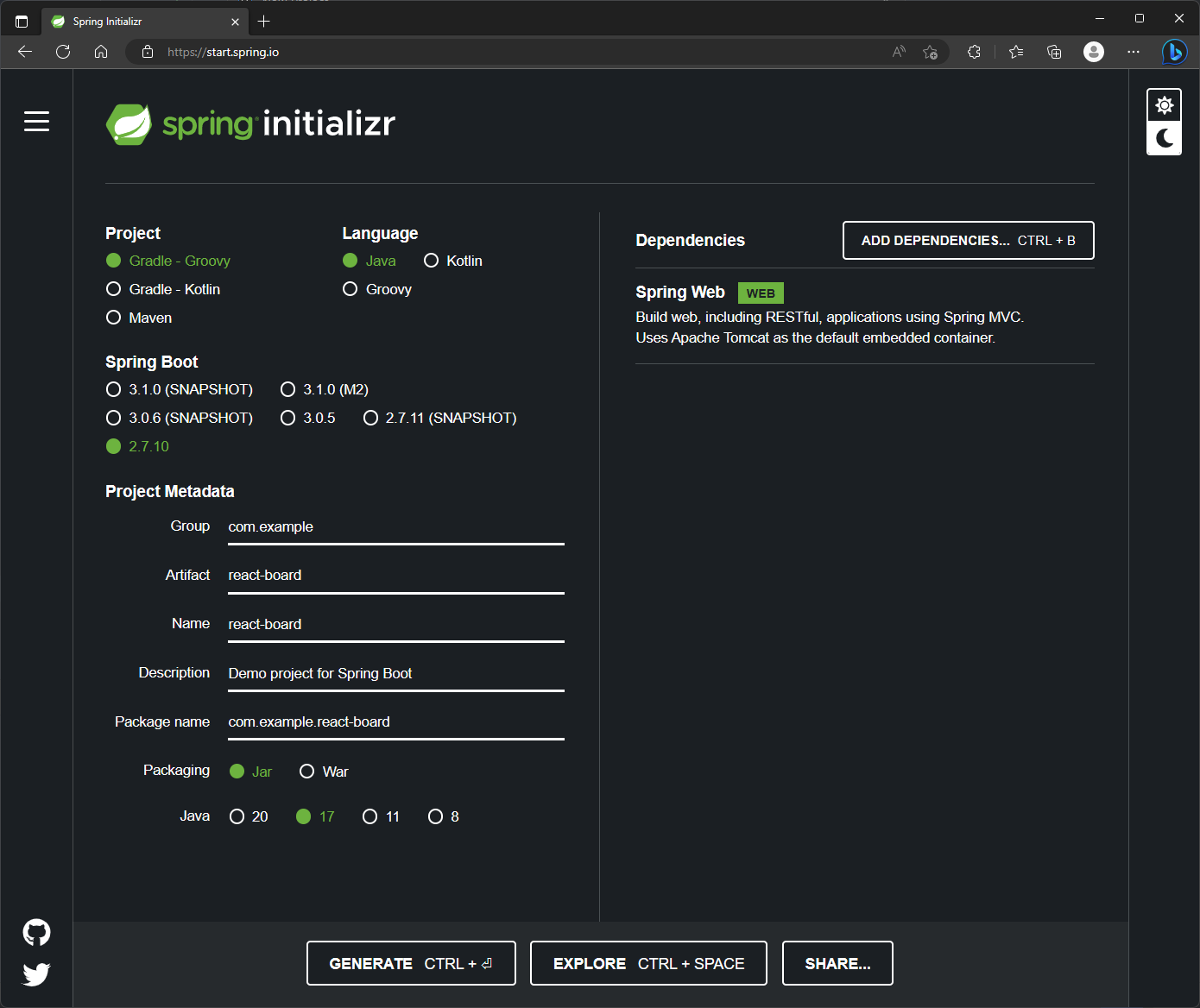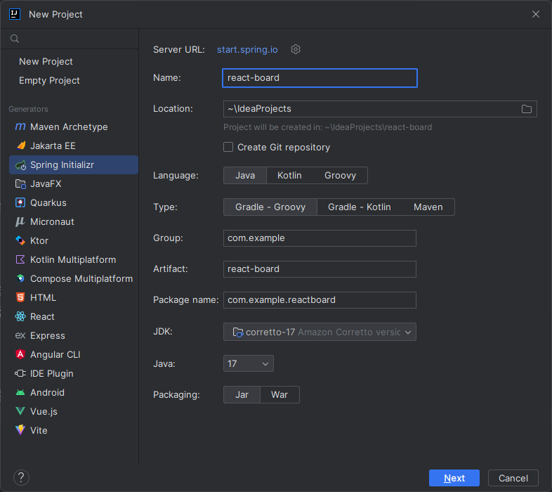 나머지는 Java, Gradle - Groovy, Java 17, Packaging Jar로 선택합니다.