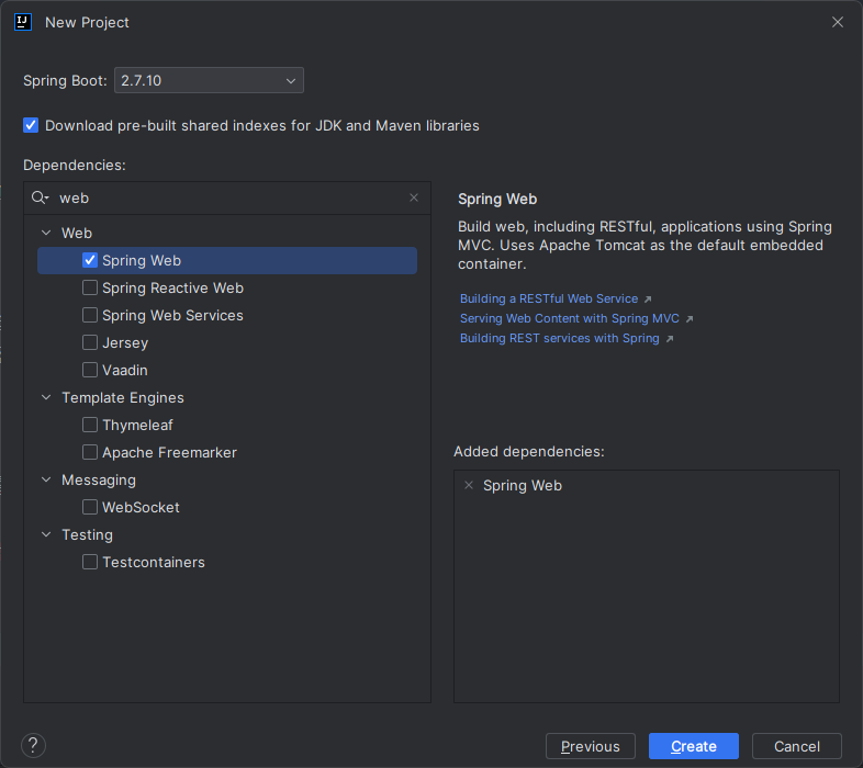 Spring Boot 버전은 2.7.10, 의존성은 Spring Web만 추가하고 Create를 눌러 완료합니다.