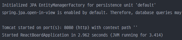 에러 메시지 없이 Tomcat started on port(s): 8080만 보인다면 부팅은 완료된 것 입니다.
