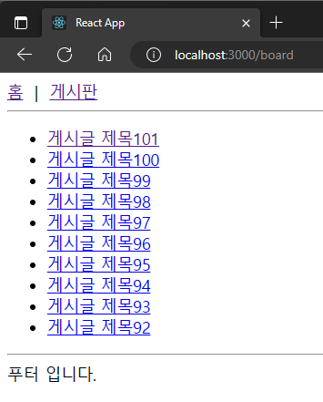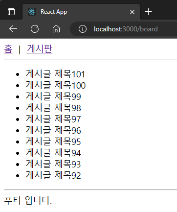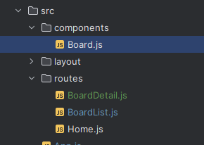 페이지 이동이 확인되었다면 src/components 디렉토리를 생성하고 Board.js 컴포넌트를 생성합니다.