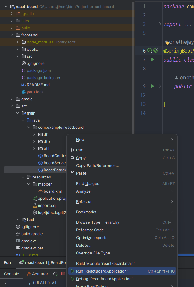 src/main/java/com.example.reactboard/ReactBoardApplication.java 파일에서 오른쪽 클릭 후 Run ReactBoardApplication을 선택합니다.