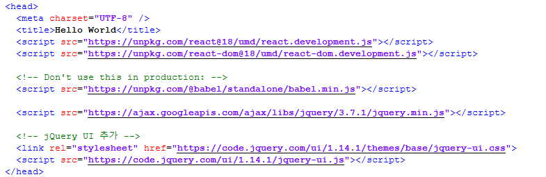 리액트 공식 사이트 설치하기의 하단 로컬 환경에서 React 시도하기 내용에 추가로 jquery 3버전을 포함하였습니다.